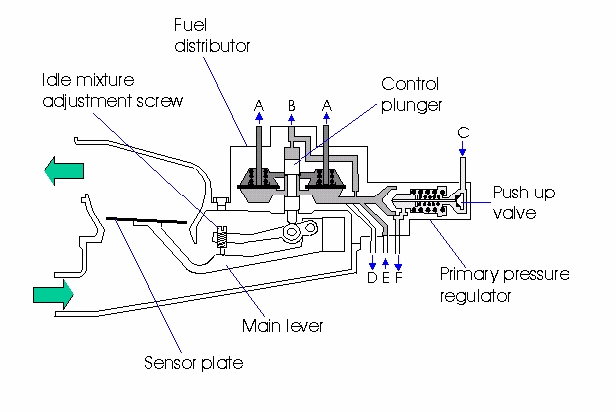 The Fuel Distribution UnitThis unit delivers the correct amount of fuel to the engine via the injectors referencing to the airflow sensor plate height. As the sensor plate is lifted with inducted air volume, the control plunger is lifted proportionately, exposing small slits within the fuel distributor's barrel assembly. The barrel assembly has a series (one for each cylinder) of small slits that are machined into the barrel, and it is through these openings that the fuel passes en-route to the injector.The width of these metered slits is only 0.2 mm across and it is this dimension, together with the plunger height, that determines the fuel delivery rate to the injectors. At low engine speed the air volume into the engine will be minimal, this will only raise the plunger a small amount giving the requisite quantity of fuel for these engine conditions. As the throttle is opened and fuel demand is higher, the plate raises, which in turn lifts the plunger and a higher volume of fuel is delivered to the engine to match the air. The lift on the plunger will be proportionate to the air volume, this will however be exaggerated during the warm-up period when additional fuel is required by reducing the pressure acting onto the top of the control plunger. This pressure is called the control pressure (as it controls the lift of the plunger under different operating temperatures) and is determined by the warm-up-regulator.